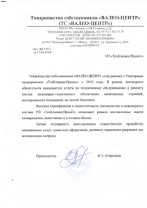 Товарищество собственников «ВАЛЕО-ЦЕНТР» сотрудничает с Унитарным предприятием «ТехКлинингПроект» с 2019 года. В рамках договорных обязательств оказываются услуги по техническому обслуживанию и ремонту систем инженерно-технического обеспечения капитальных строений, изолированных помещений, их частей Заказчика. Высокая квалификация и компетентность специалистов и инженерного состава...