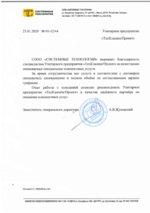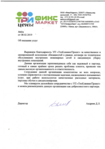 СООО "Системные технологии" выражает благодарность специалистам Унитарное предприятие "ТехКлинингПроект" за качественно оказываемые клининговые услуги. За время сотрудничества все услуги в соответствии с договором оказывались своевременно и в полном объёме по согласованным заранее графикам. Опыт работы с компанией позволяет рекомендовать Унитарное...