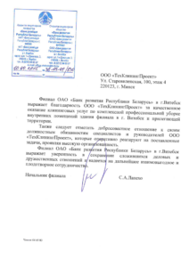 Филиал ОАО «Банк развития Республики Беларусь» в г. Витебск выражает благодарность ООО «ТехКлинингПроект» за качественное оказание клининговых услуг по комплексной профессиональной уборке внутренних помещений здания филиала в г. Витебск и прилегающей территории. Также следует отметить добросовестное отношение к своим должностным...
