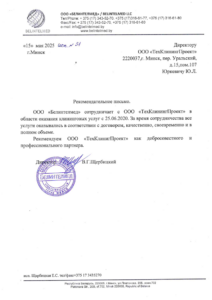 ОАО «БЕЛНИИЛИТ» сотрудничает с ООО «ТехКлинингПроект» в области оказания клининговых услуг. За время сотрудничества все услуги оказывались в соответствии с договором, своевременно и в полном объеме. Рекомендуем ООО «ТехКлинингПроект» как добросовестного и профессионального партнера.