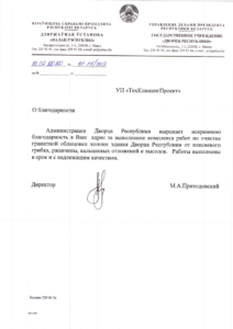 Администрация Дворца Республики выражает искреннюю благодарность в Ваш адрес за выполнение комплекса работ по очистке гранитной облицовки колонн здания Дворца Республики от плесневого грибка, ржавчины, кальциевых отложений и высолов. Работы выполнены в срок и с надлежащим качеством.