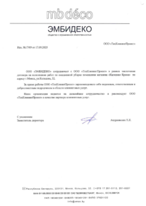 ООО «ЭМБИДЕКО» сотрудничает с ООО «ТехКлинингПроект» в рамках заключения договора на выполнение работ по ежедневной уборке помещения магазина «Калядная Крама» по адресу г.Минск, ул.Кольцова, 32. За время работы ООО «ТехКлинигПроект» зарекомендовало себя надежным, ответственным и добросовестным подрядчиком в области клининговых...