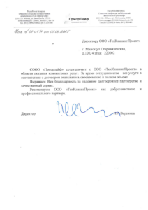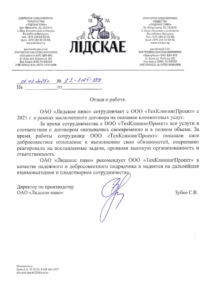 ОАО «Лидское пиво» сотрудничает с ООО «ТехКлинингПроект» с 2021 г. в рамках заключенного договора на оказание клининговых услуг. За время сотрудничества с ООО «ТехКлинингПроект» все услуги в соответствии с договором оказывались своевременно и в полном объеме. За время работы сотрудники...