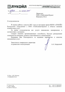 В период работы с августа 2021 года по настоящее время ИООО «ЛУКОЙЛ Белоруссия» сотрудничает с ООО «ТехКлинингПроект» в области оказания клининговых услуг. За время сотрудничества все услуги оказывались своевременно в соответствии с договором. Следует отметить организационную способность, быстрое реагирование специалистов...