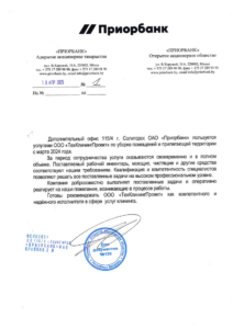 Дополнительный офис 115/4 г. Солигорск ОАО «Приорбанк» пользуется услугами ООО «ТехКлинингПроект» по уборке помещений и прилегающей территории с марта 2024 года. За период сотрудничества услуги оказываются своевременно и в полном объеме. Поставляемый рабочий инвентарь, моющие, чистящие и другие средства соответствуют...